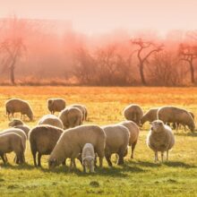 野原では羊が草を食べている